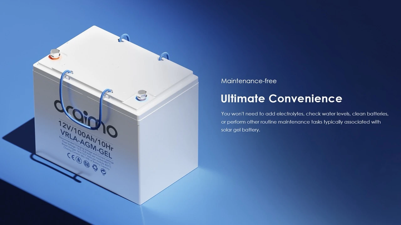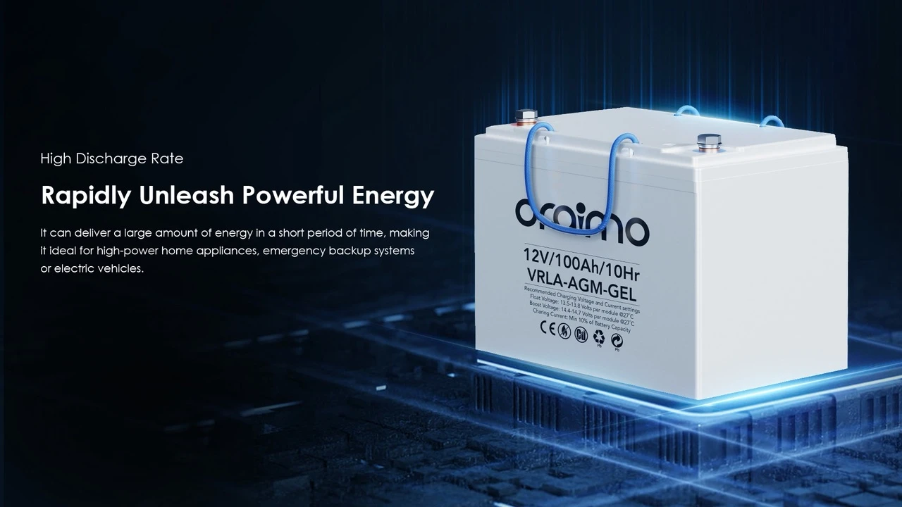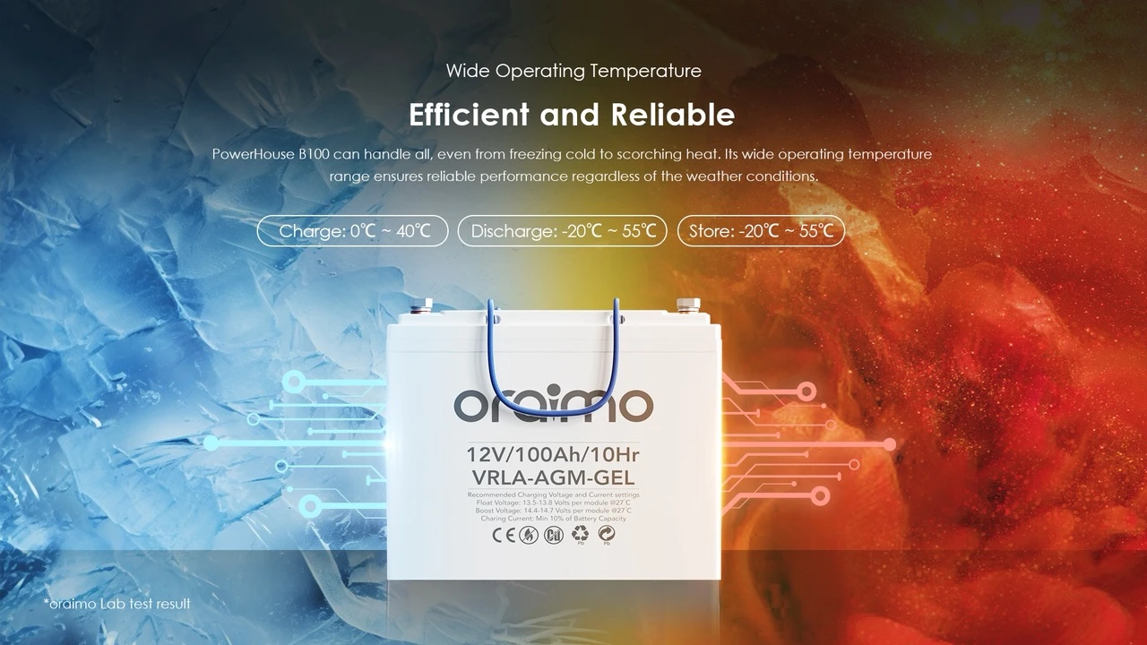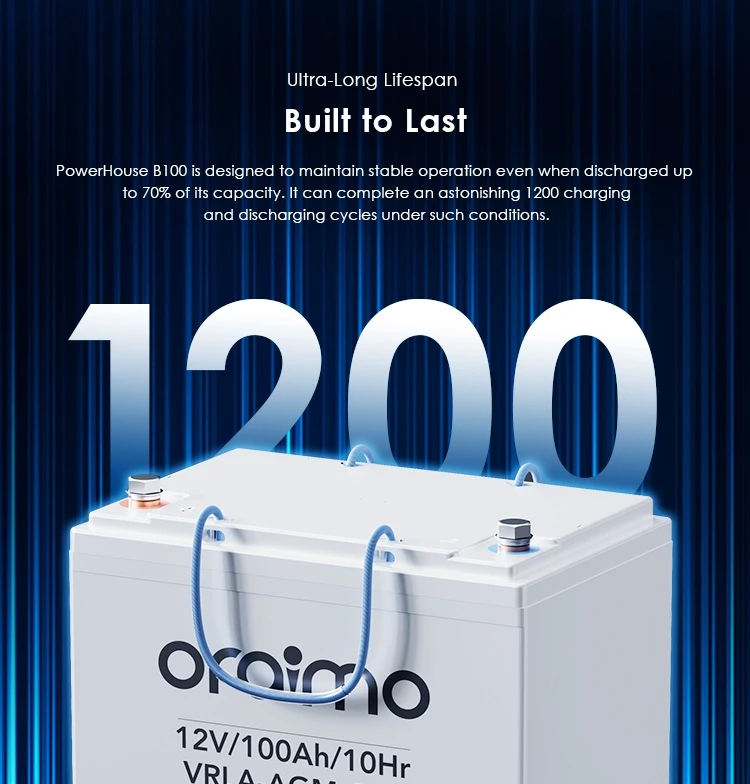 ORAIMO POWERHOUSE B100 OLB-1101 IS A 12V 100AH LEAD-ACID STORAGE BATTERY WITH UP TO 1200 CYCLES LIFE, OFFERING DEPENDABLE AND ULTRA-DURABLE ENERGY STORAGE FOR BACKUP POWER, RENEWABLE ENERGY SYSTEMS, HOME OR OFFICE USE. IT FEATURES MAINTENANCE-FREE OPERATION, HIGH DISCHARGE RATE, WIDE OPERATING TEMPERATURE RANGE, AND ESSENTIAL MULTI-PROTECTION FOR RELIABLE, SAFE PERFORMANCE. COMPACT SIZE: 259×168×211MM.