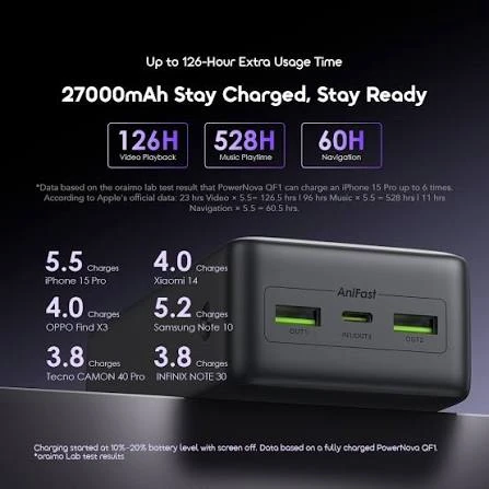 • 27000MAH ULTRA-HIGH CAPACITY FOR EXTENDED USE AND MULTIPLE CHARGES (UP TO 126 HOURS EXTRA USAGE)